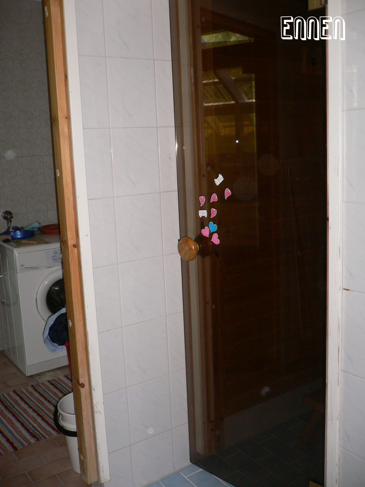Kylppäritila oli alunperin - miten sen nyt sanoisi - aika karu ja toimimaton, ja siihen oli ympätty mukaan kodinhoitotilat. Nyt kylpyhuone ja sauna on pyhitetty vain ihmisten hoitoon. Vaatehuolto on siirretty yläkertaan. Siellä kun on älyttömän kokoinen varasuihku/-wc tyhjänpanttina. Taso pelittää hyvin vauvan hoitopöytänä ja Kvikin kalusteet syövät uskomattoman määrän roinaa.
